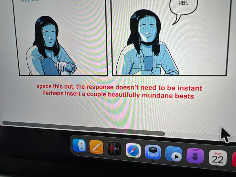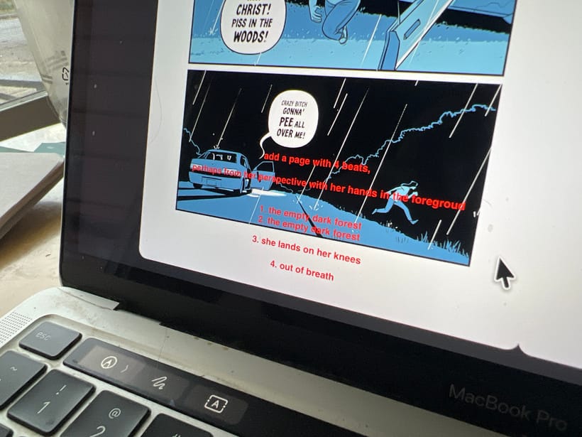 With me, and comics, that usually means opening a PDF version of the book as it stands in Preview on macOS and reading through it, trying to experience the book like someone who’s never seen it before. I’ll spot small beats that want to be added, others that need cutting, and places that aren’t working. When I’ve had enough distance, the reasons are usually obvious. That clarity only shows up after stepping out of the weeds. While I'm writing the first draft and drawing the first pages, I still have a million thoughts in my head like "What if this were drastically different? What if this character wasn't in this scene? What if? What if? What if?"